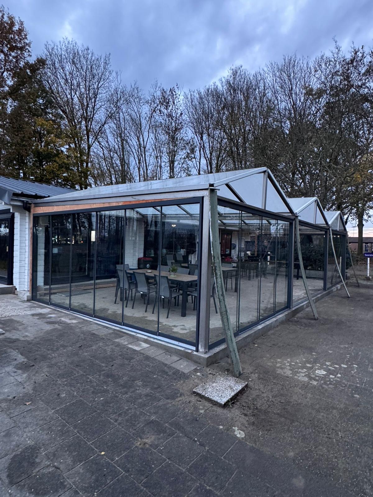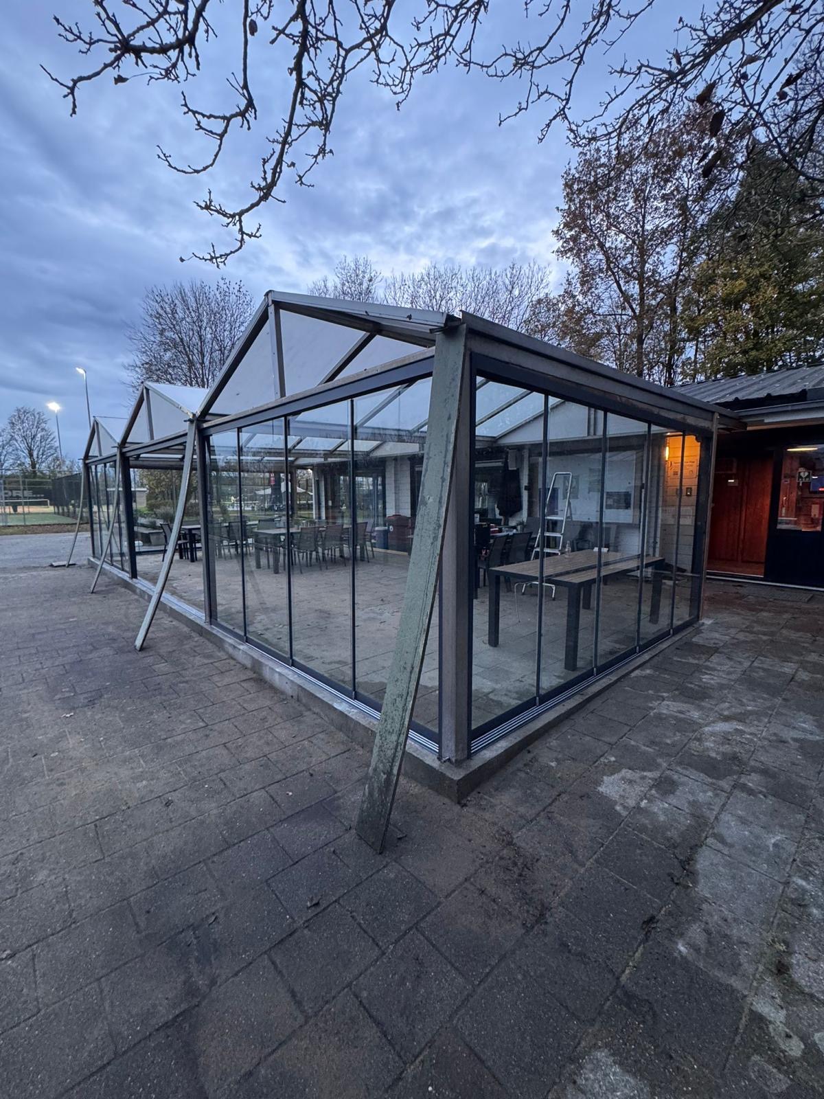 In zeer korte tijd hebben een aantal geweldige leden een prachtige serre gerealiseerd aan ons bestaande afdak. De ruimte is voorzien van glazen wanden waardoor we in de winter met de heaters sfeervol buiten kunnen zitten. In de zomer kunnen de deuren open of dicht en genieten we tot laat van een comfortabele en open sfeer.